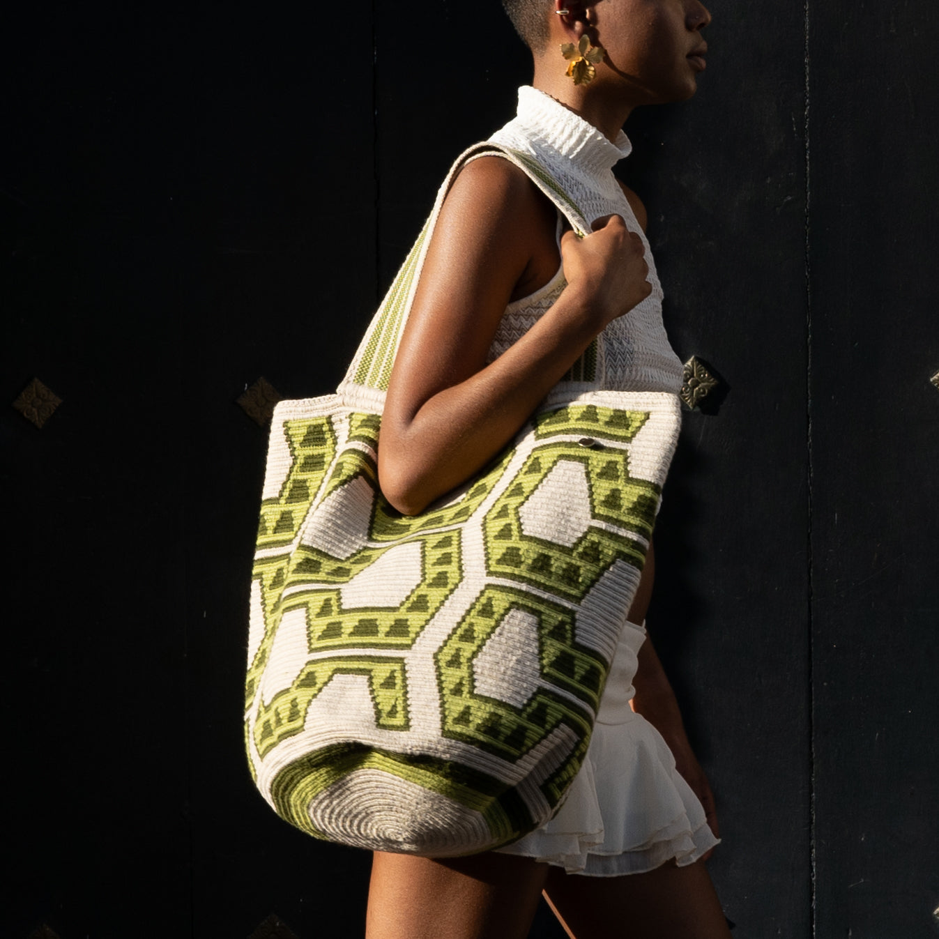 Con una base en beige suave como la arena del desierto guajiro y un patrón tradicional Wayuu tejido en verdes pistacho y aceituna, el mochilón Chelo es un homenaje a la conexión entre naturaleza, tradición y estilo contemporáneo.